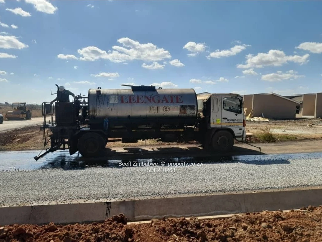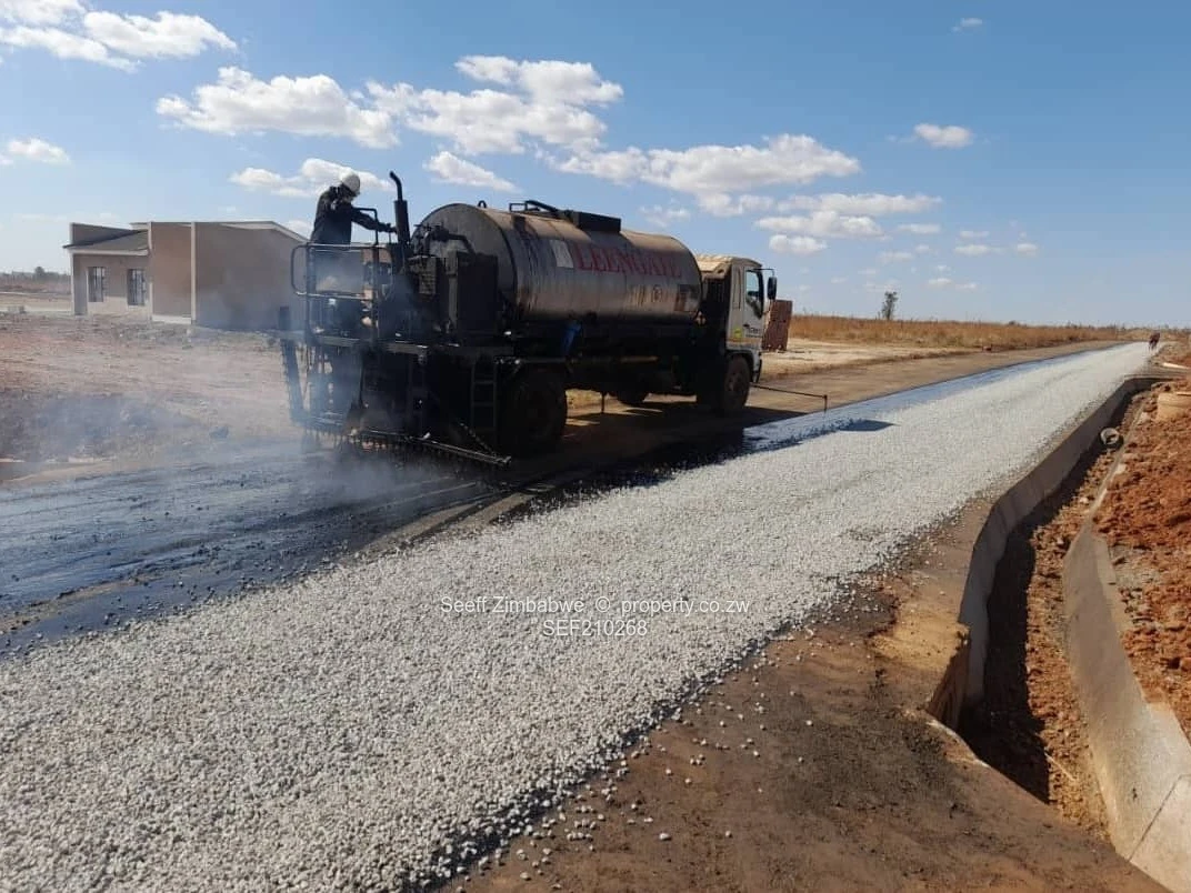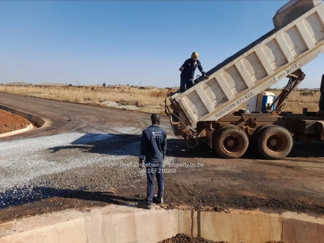 Prime 300 m² stand for sale in Nyabira, Mashonaland West — perfect for your starter home or investment. Situated in a new, fast-developing residential estate, the photographs show contemporary single-storey homes with clean cream facades, pitched roofs and large windows already rising on neighbouring plots. On-site infrastructure is underway: professionally curbed streets, visible storm drainage and road surfacing in progress with chip-seal/tar application and stone overlay, plus delivery trucks and contractors actively finishing the roads. The level, well-cleared plot offers easy building access and clear boundaries, making foundation work straightforward and cost-effective. Enjoy the appeal of a modern suburban neighbourhood with strong development momentum — ideal for buyers wanting immediate occupation once construction begins or investors seeking future capital growth. Contact us today to reserve this serviced stand and secure your place in Nyabira’s growing community.