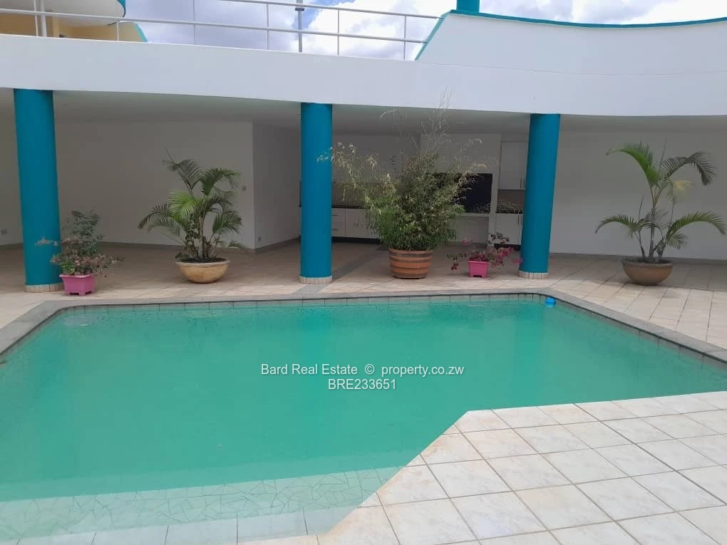 An imposing double storey house in Mt Pleasant, close to the University suitable for owner occupation, guest house, a medical facility and or offices. The house, so mature and in a mature suburb offers the entrance hall,3 lounges, modern fitted kitchen with wall and floor cupboards with granite tops, dining room overlooking the pool, pantry, guest toilet and veranda. The upper floor, accessed through a staircase offers the landing pad, main bedroom with dresser, jacuzzi tub & glass shower cubicle and 5 other bedrooms with own bathrooms, fitted wardrobes and balconies.