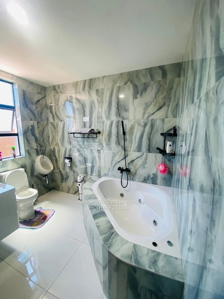 Combined Bathroom and toilet with glazed Wall Tiles to give an exceptional aesthetic appeal. Comes with a coner bathtub and a free standing and ceramic washing basin.