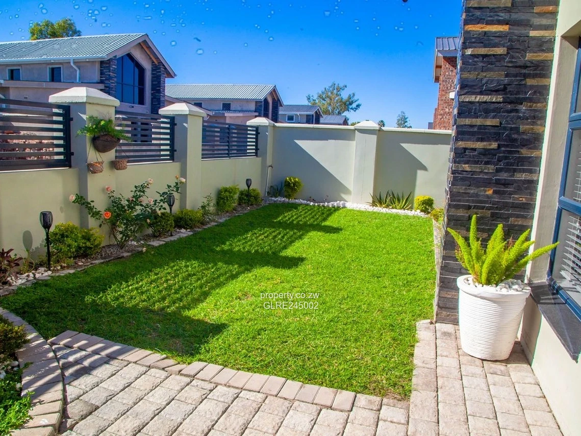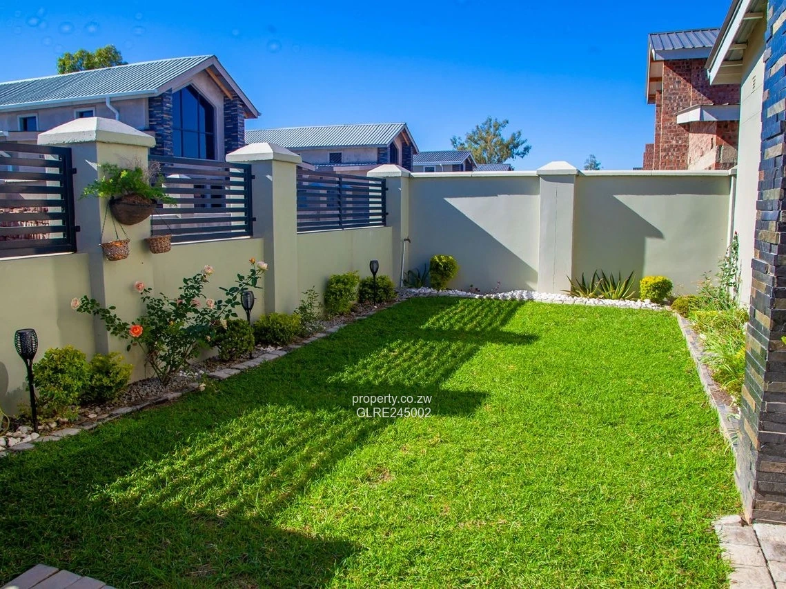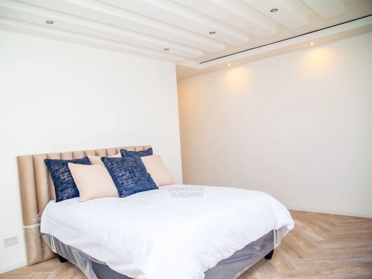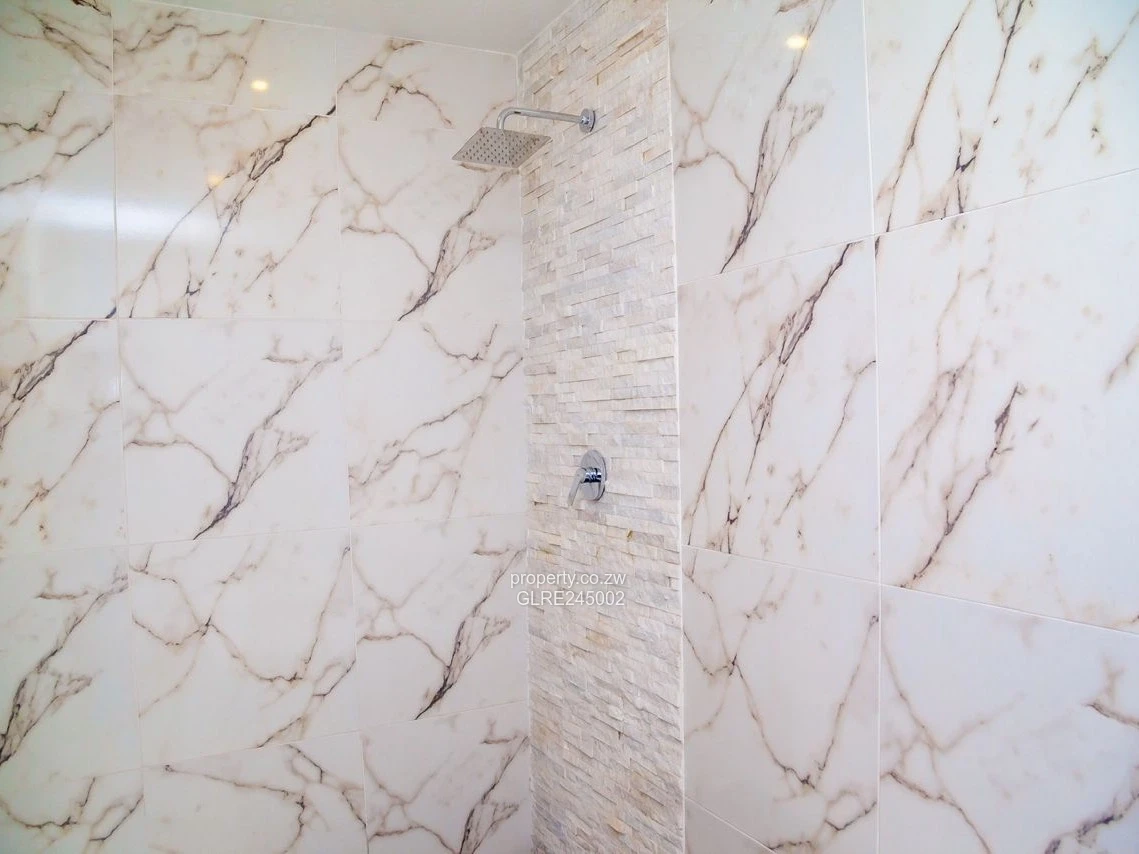 Bathrooms are finished in elegant marble-effect tiles with contemporary fittings and a walk-in shower, creating a luxurious yet easy-care feel. High ceilings, abundant natural light and quality flooring give each living area a bright, airy ambience. The property includes its own borehole, providing reliable water supply — a highly desirable feature in Harare.