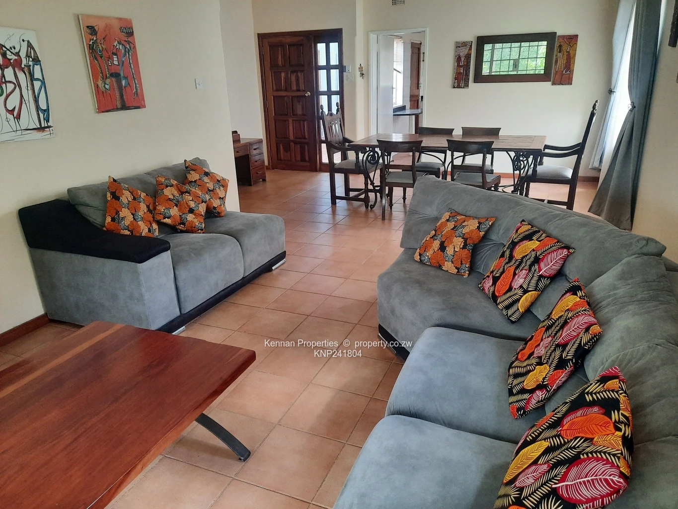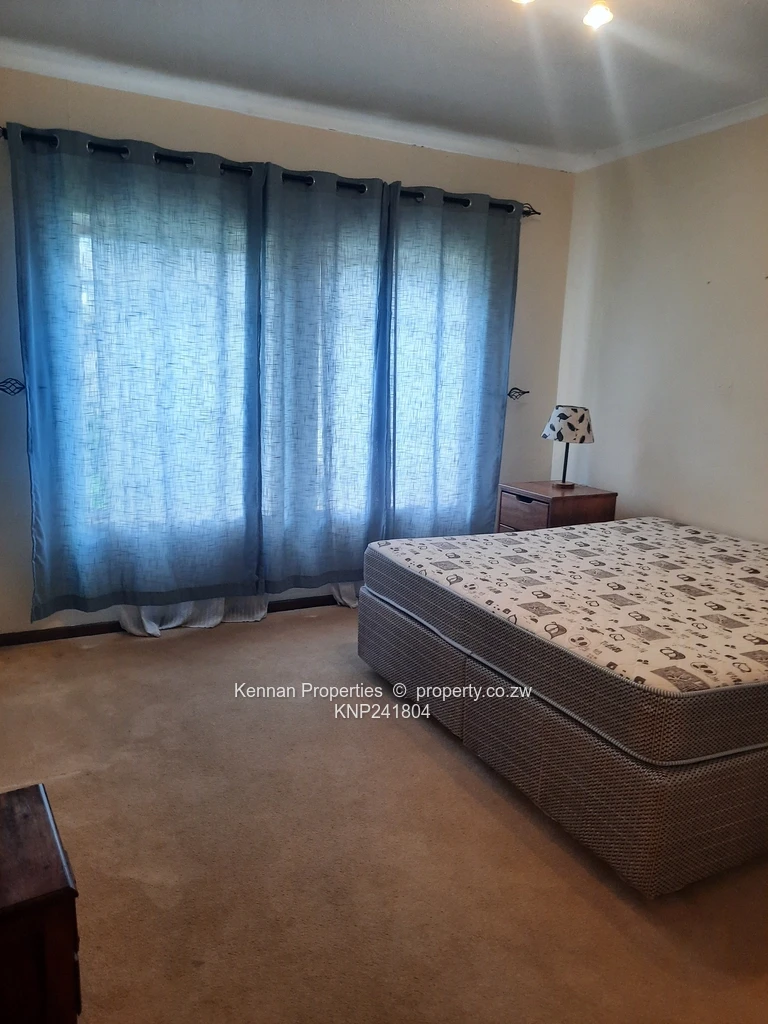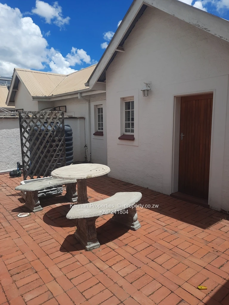 3 bedrooms 2 bathrooms (MES). Open plan lounge/ dining room onto veranda and a lovely little garden. The kitchen is well fitted with gas hob and oven, a large pantry and with a separate laundry outside. There is a single lock up garage with workshop or storeroom as well as a double shadeport.This unit comes with 10 solar panels, 5Kva inverter and batteries. The whole Complex, comprising 14 units, is very well secured. There is a very good borehole in the complex and this unit has a 2 000 litre water storage tank and EXCELLENT ZESA – on same line as hospitals. The levy of USD150 per month includes a gardener for a couple of hours twice a week to do basic maintenance. In Company Name so no transfer fees.