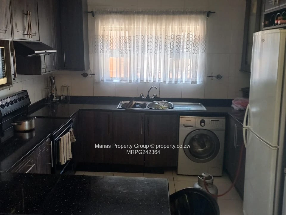 Modern townhouse complex in Greendale, Harare East — a smart investment or comfortable family home on a generous 2,000 m² stand with 500 m² built area. This fully furnished three-bedroom, two-bath unit (one of several on the property) features a bright open-plan living area shown in the photos with tiled floors, mounted TV and comfortable leather seating with vibrant red accents. The contemporary kitchen has dark wood cabinetry, black countertops, a freestanding stove, fridge and an in-unit washing machine as seen in the images — move-in ready.