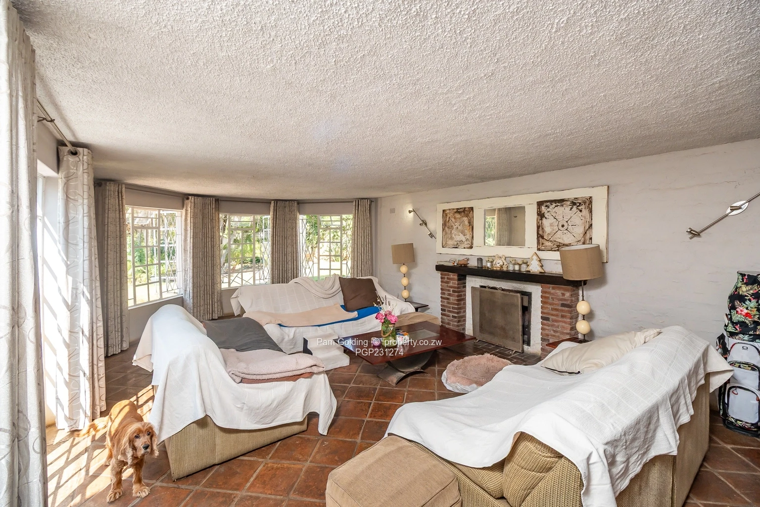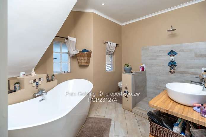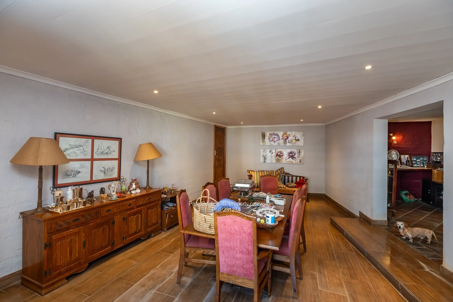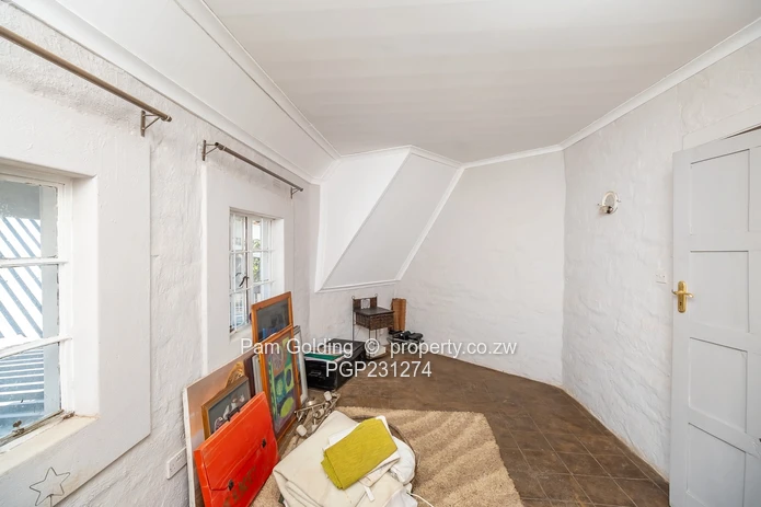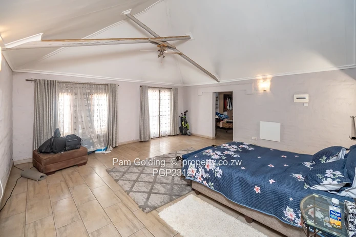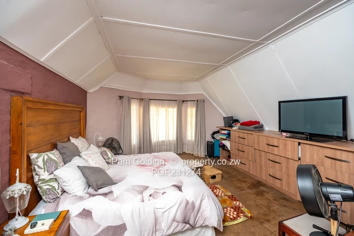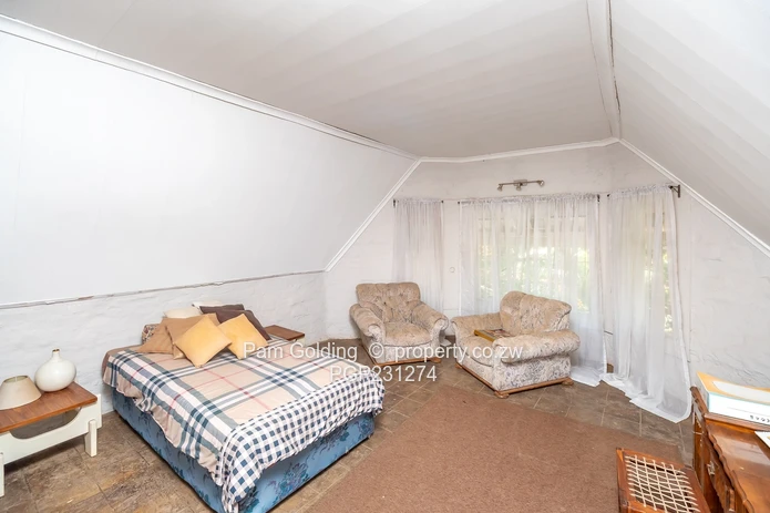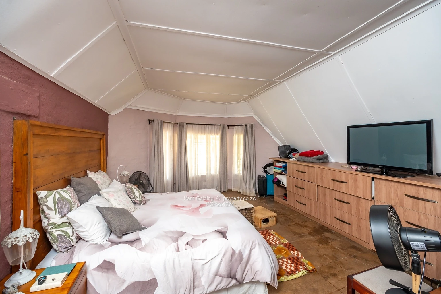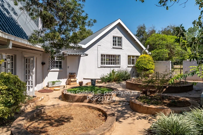 Versatile living spaces abound, including a bright lounge, enhanced by angled ceilings and an inviting atmosphere. The property also boasts a charming outdoor area with a landscaped garden and a sparkling swimming pool, perfect for entertaining.