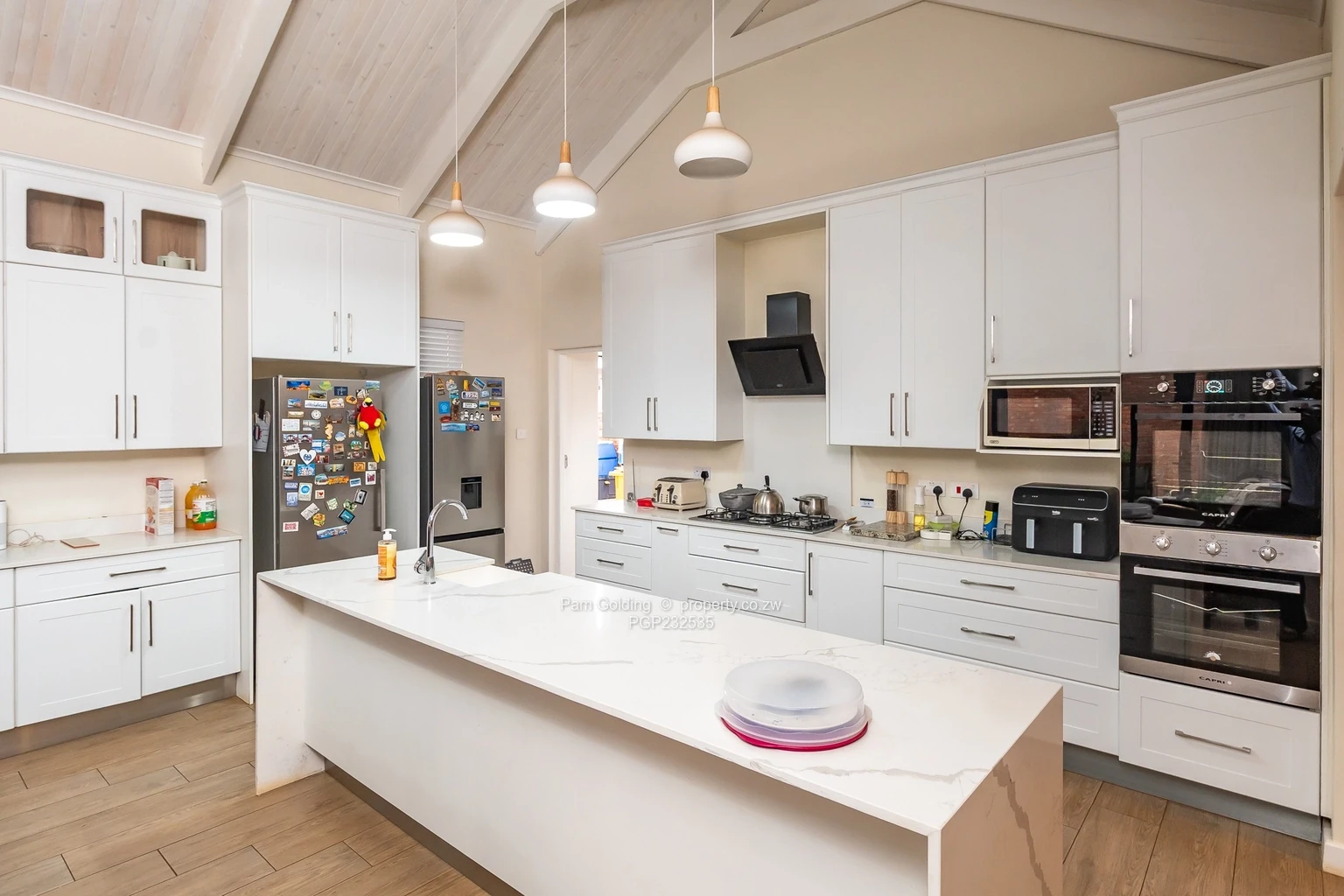 The home offers 3 bedrooms (2 en suite) and a guest bathroom. An open-plan kitchen, dining, and lounge area, with a separate scullery and a storeroom/walk-in pantry for added convenience.