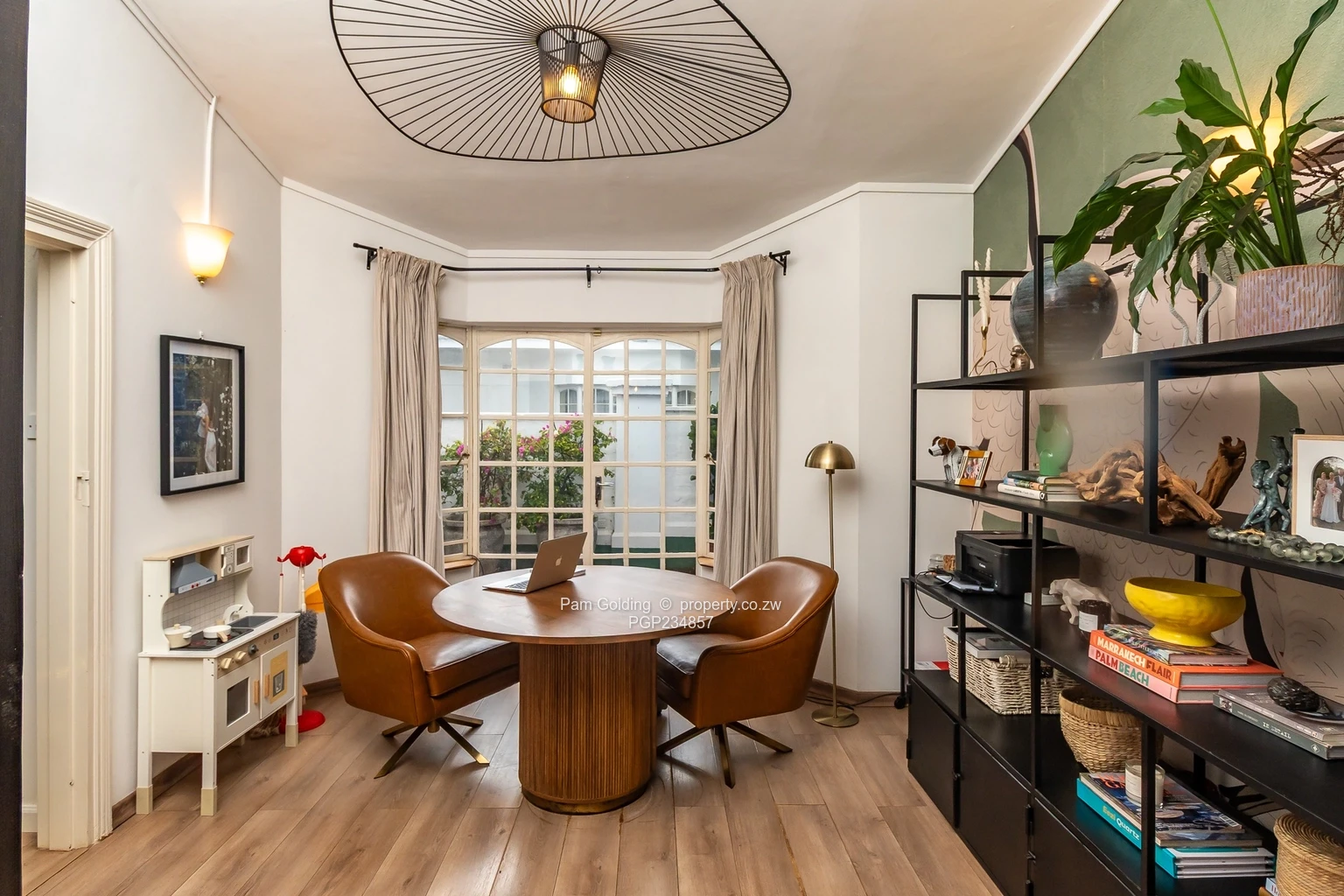 The open-plan dining room connects to the lounge with a fireplace. There is also a second dining area currently used as an office.