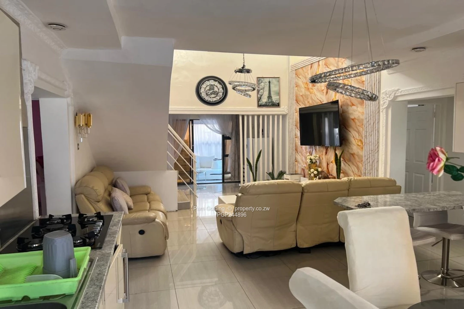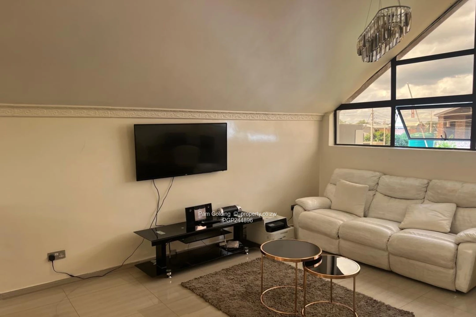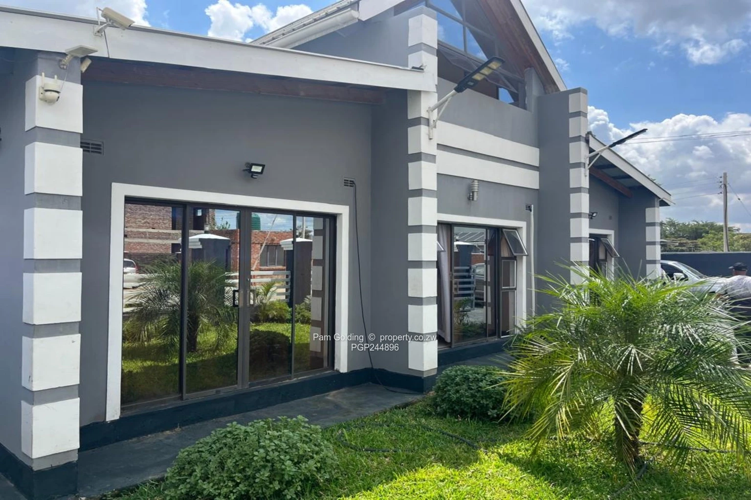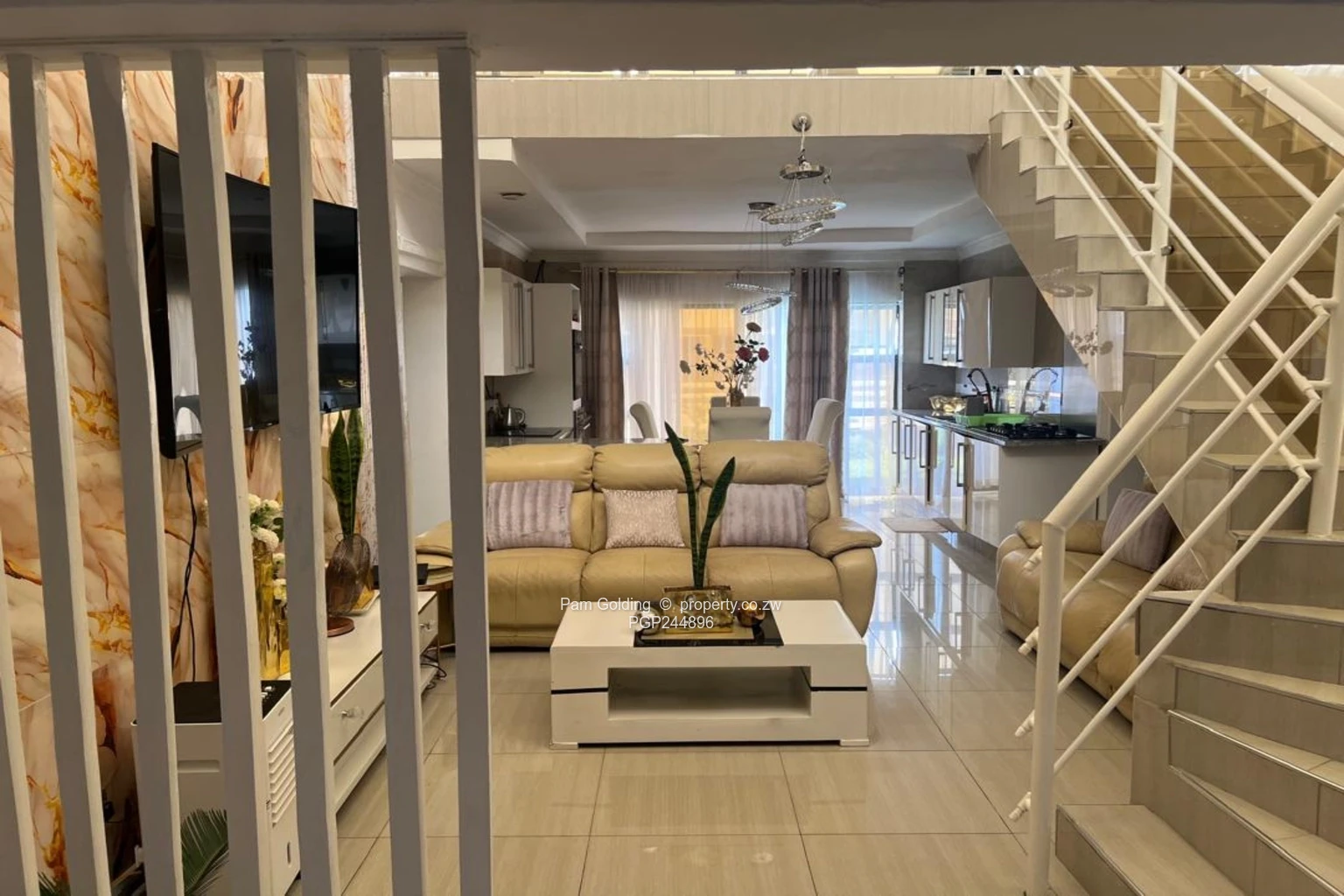 Three bedrooms plus a study, two bathrooms, open plan kitchen, main lounge and separate sun lounge, loft converted into a second lounge cum office. 3KVA solar system. Modern fittings all round. The exterior has double carport and a braai area. Communal borehole. All sitting on 452 sqm of land