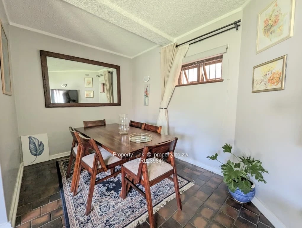 The open-plan living and dining room area provides a comfortable relaxation space including a fireplace. This is complemented by stepping into the inviting landscaped back garden with a wonderful outdoor seating area on the covered verandah with a built-in braai, perfect for being social while leisurely preparing your meals for al fresco dining.