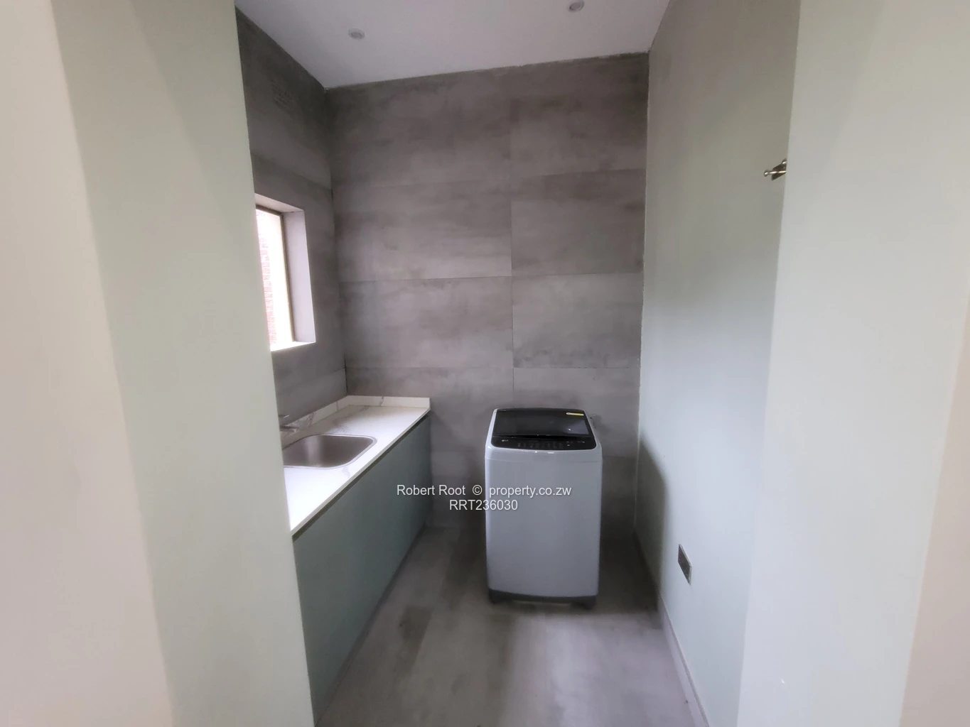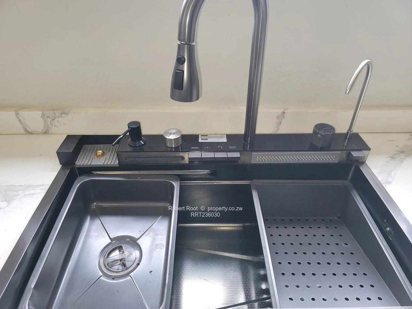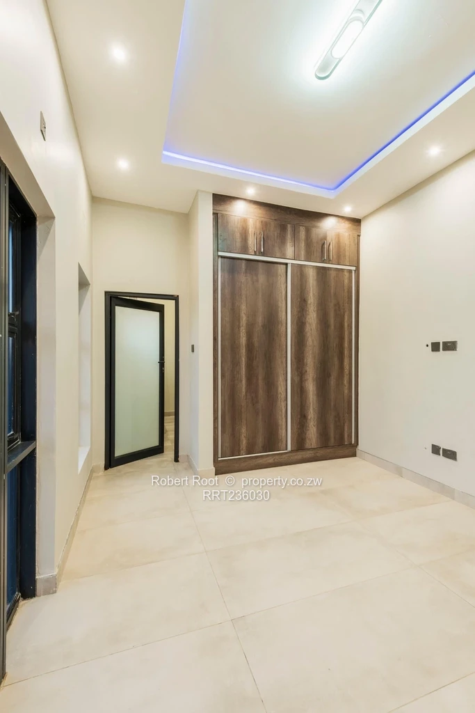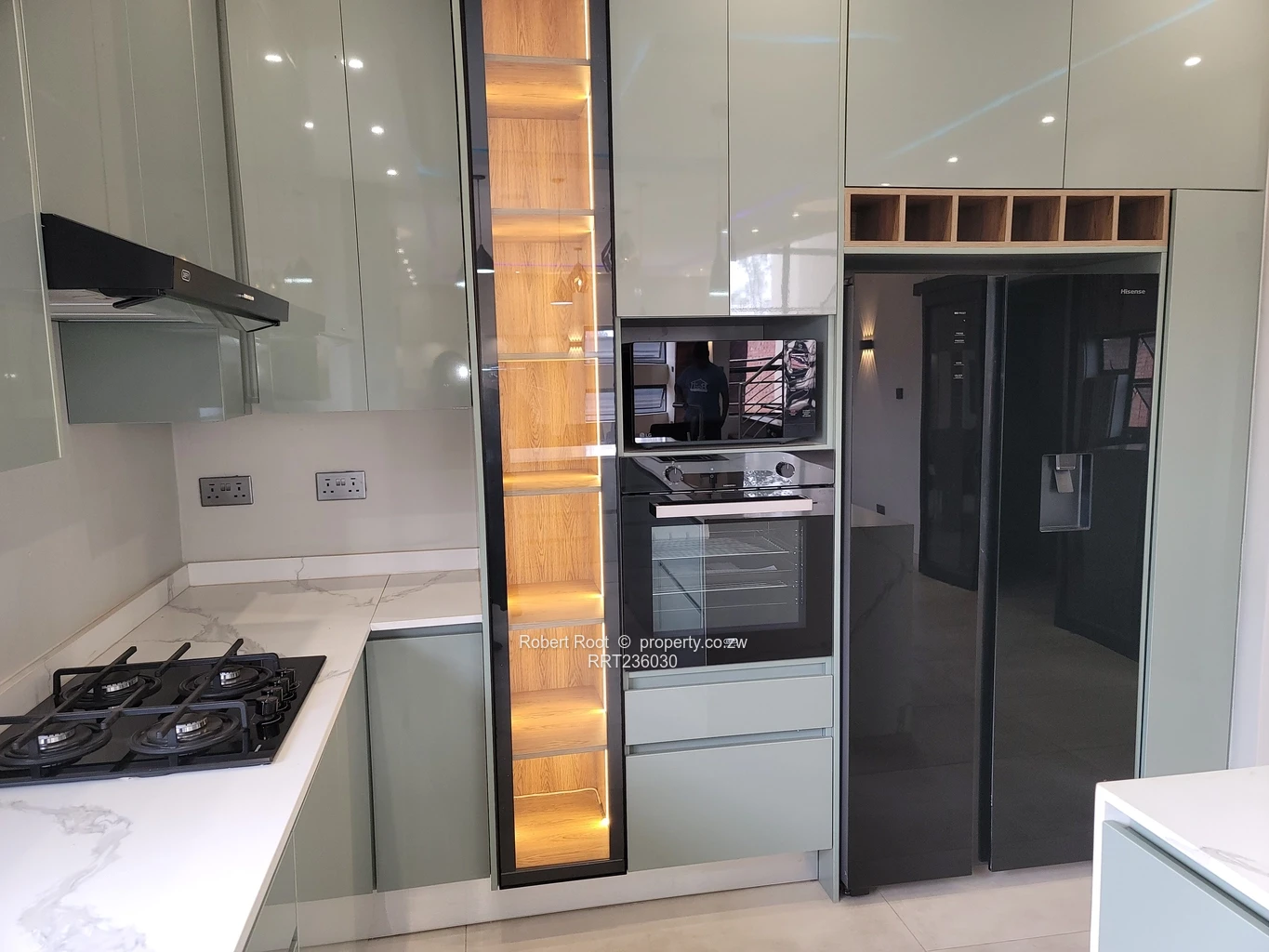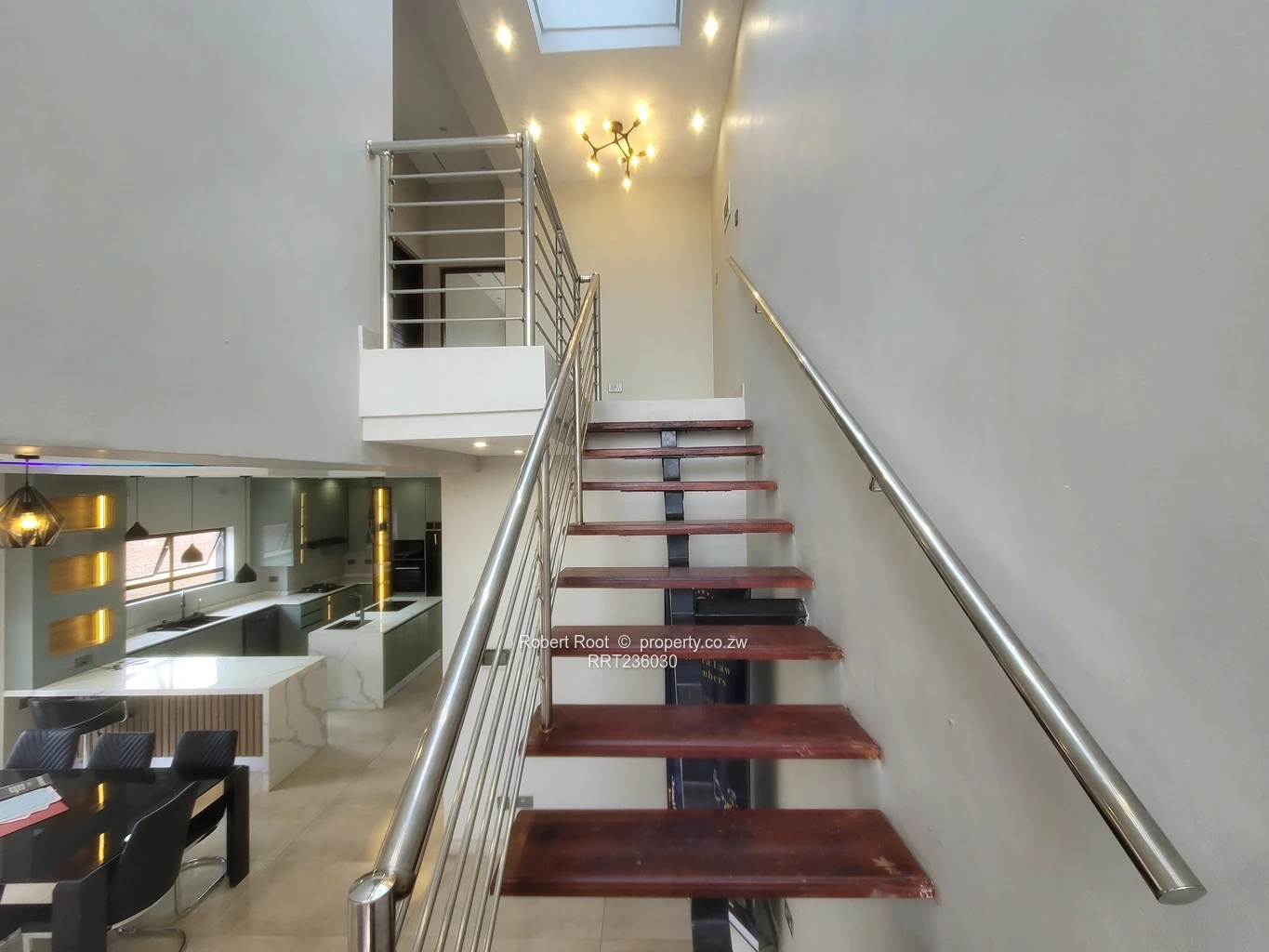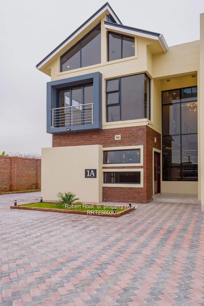 Stunning contemporary townhouse in a secure Goodhope complex, Harare West — a perfect blend of style and practical living. This 4-bedroom, 5-bath home sits on a 500 m² stand with a 150 m² build, featuring a striking modern facade, paved parking and gated entrance. Inside, enjoy an expansive open-plan living and dining area with tiled floors, recessed purple LED cove lighting and a built-in entertainment wall. The chef’s kitchen is fitted with sleek grey cabinetry, a central island with hob, built-in oven, stainless steel sink and drainer, integrated fridge alcove and stylish pendant lighting. A bright double-volume stairwell capped by a large skylight and glass balustrade staircase floods the home with light. Ground-floor guest bathroom, upstairs family bathrooms with contemporary fittings, and generous built-in wardrobes in the bedrooms ensure comfort and convenience. Additional highlights include a dedicated laundry area, tasteful wooden slat feature walls, quality finishes throughout and reliable water supply from an on-site borehole. Ideal for family living or as an investment in Harare West — close to schools, shopping and major routes. Full automation of lighting, security, irrigation and entertainment systems via smartphone or tablet. Viewing recommended; this turnkey property combines modern aesthetics with everyday functionality.