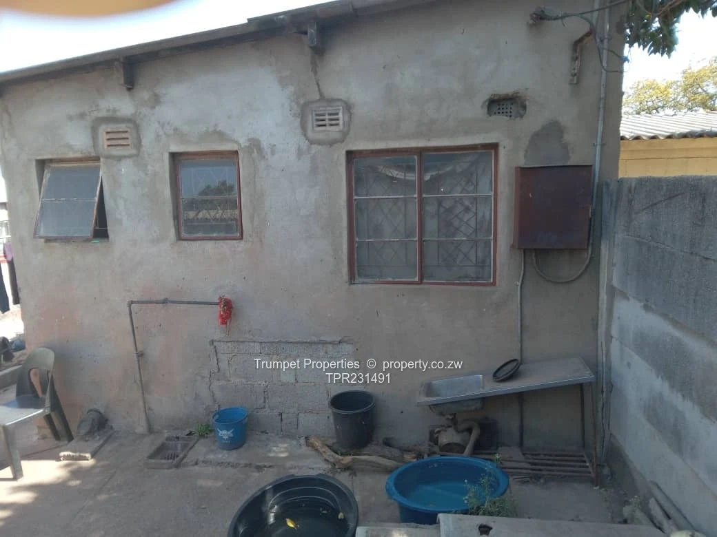 Practical amenities include a functioning sewer system and external water point with a stainless steel wash-up area — ideal for everyday convenience and rental management. The rear courtyard is paved for low maintenance and currently houses water storage containers and a shaded area beneath a mature tree, creating a private outdoor spot for tenants or family use. The exterior shows areas of original plaster that have been touched up, offering a solid canvas for cosmetic refurbishment to add value quickly.