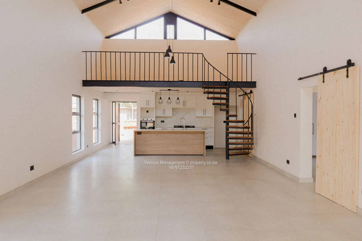 The main living area flows easily into a stylish kitchen fitted with light wood cabinetry, a centre island, and large windows that bring in plenty of natural light. A spiral staircase leads up to a loft area that can be used as an office, TV lounge or extra living space.