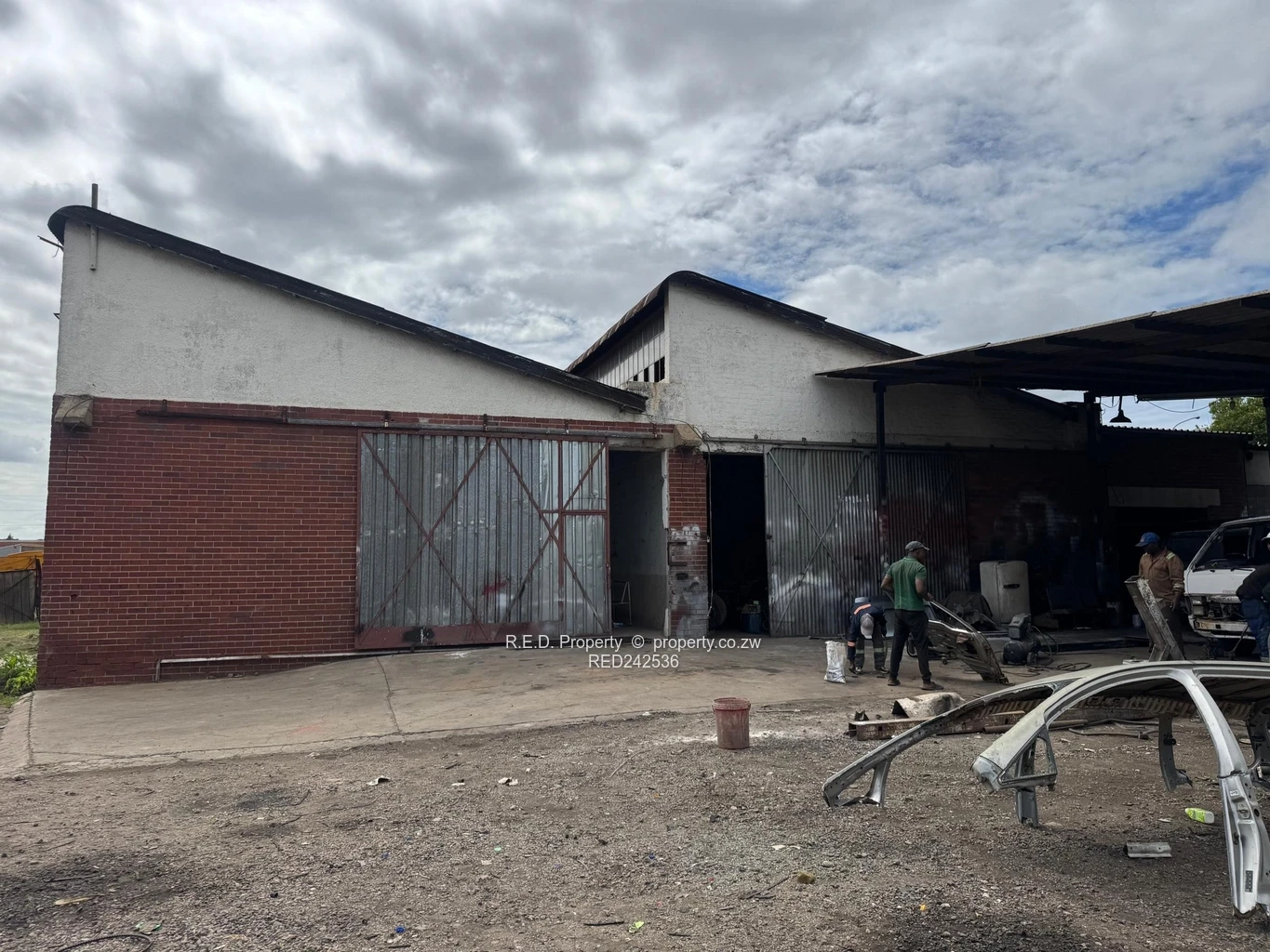 Attached to the main building is a covered lean-to structure with a mechanical pit, ideal for vehicle maintenance, servicing, or workshop activities.